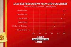 体育资讯10月9日讯 加盟曼联以来,阿莫林已经率队踢了34场英超比赛,但他的执教表现远远没能达到外界的期望。根据天空体育的数据统计,阿莫林前34场英超比赛仅仅拿到37分,低于之前数位曼联主帅所拿到的积分。